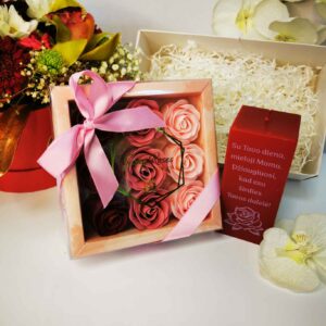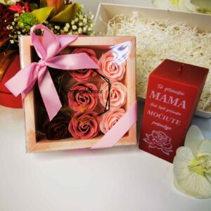 Dovanų rinkinukas 4dalių kūno priežiūros rinkinys, žvakė rožinė, muilo rožė „Mama močiutė”