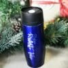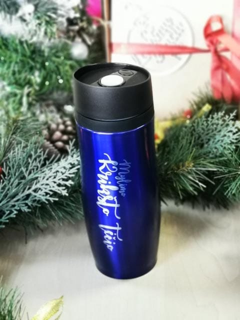 Termo puodelis su užrašu. Dviguba sienelė su oro tarpu, nuo išsiliejimo apsaugantis dangtelis.
