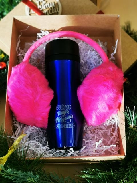 Dovanų rinkinys, kurį sudaro termo puodelis su dviguba sienele, dangteliu saugančių nuo išsiliejimo, šiltos pliušinės ausinės. Supakuota dėžutėje