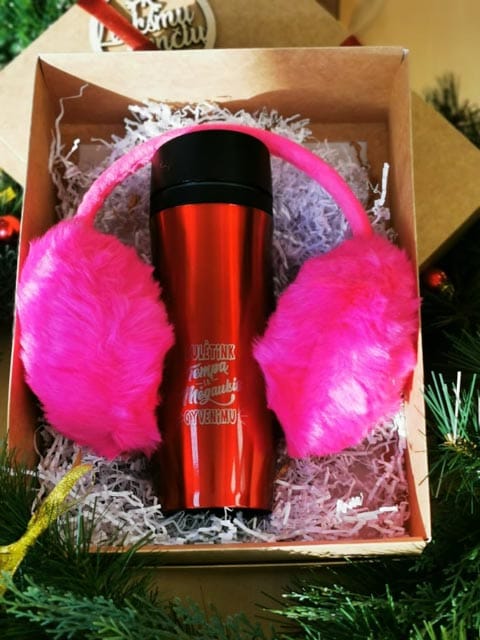 Dovanų rinkinys, kurį sudaro termo puodelis su dviguba sienele, dangteliu saugančių nuo išsiliejimo, šiltos pliušinės ausinės. Supakuota dėžutėje