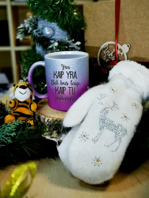 Dovanų rinkinys ” Šiltos rankytės silver glitter” puodelis 330ml, pirštinės, tigriukas