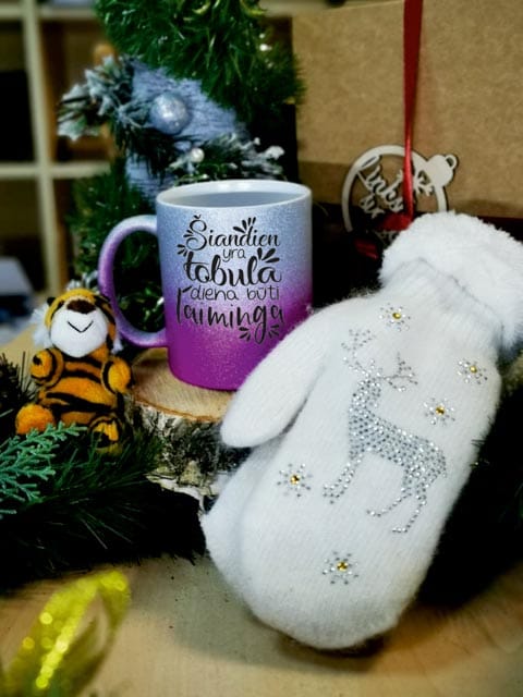 Dovanų rinkinys ” Šiltos rankytės silver glitter” puodelis 330ml, pirštinės, tigriukas