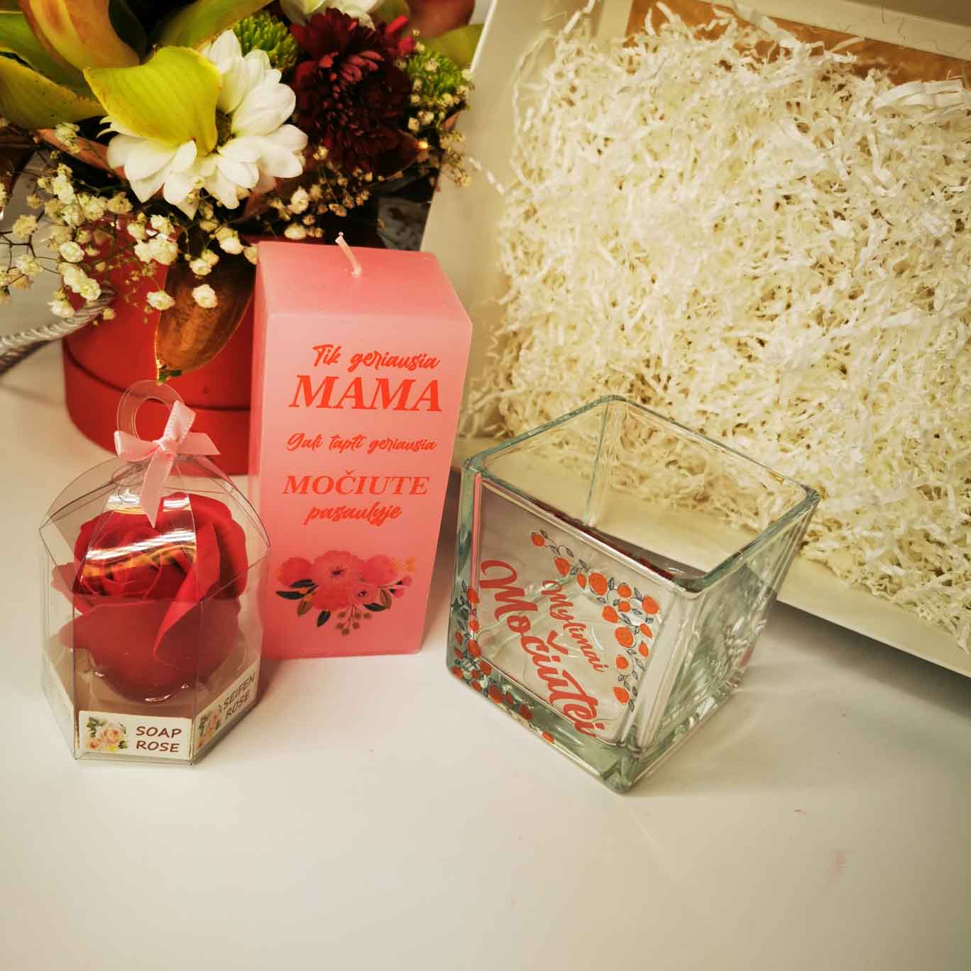 Dovanų rinkinukas mamos dienos proga. Rankų darbo žvakė, muilo rožė, vazelė