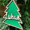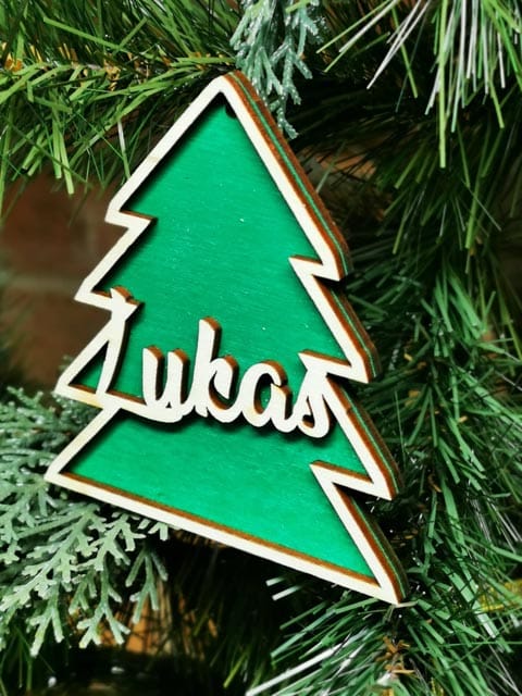Lazeriu pjautas iš dviejų sluoksnių 3mm faneros kalėdinis žaisliukas su norimu vardu.