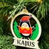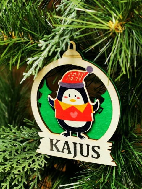 Lazeriu pjautas iš dviejų sluoksnių 3mm faneros kalėdinis žaisliukas su norimu vardu.