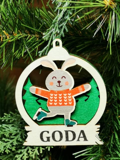 Lazeriu pjautas iš dviejų sluoksnių 3mm faneros kalėdinis žaisliukas su norimu vardu.