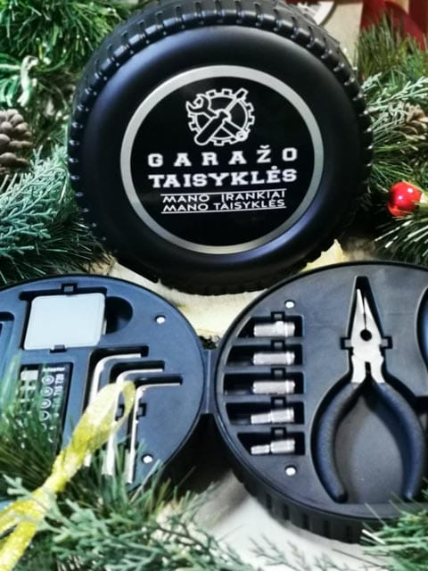 Įrankių rinkinys 25 vnt., supakuotas į padangos formos kasetę