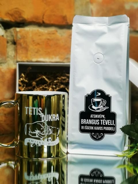 Keramikinis auksinis puodelis 330ml talpos bei kava 250gr.