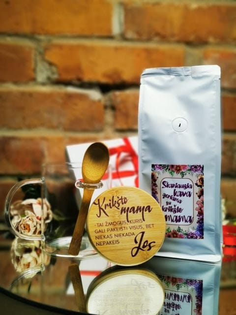 Rinkinukas stiklinis puodelis ir kava krikšto mamai