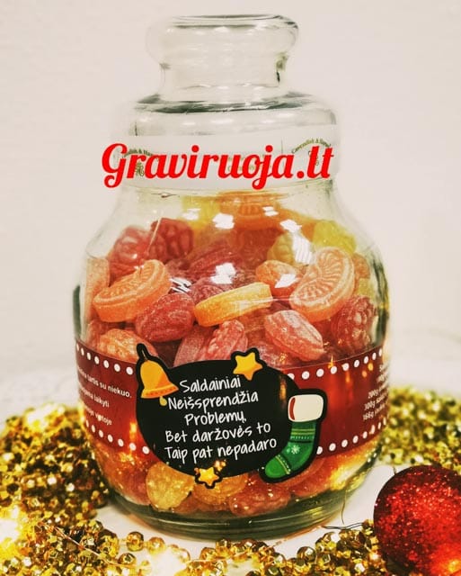 Stiklainis ledinukų su užrašu: Saldainiai neišsprendžia problemų