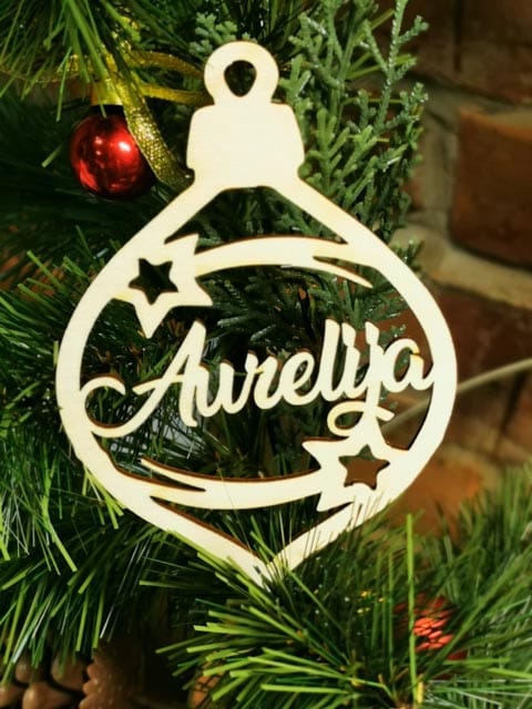 Lazeriu pjautas iš  3mm faneros kalėdinis žaisliukas su norimu vardu.
